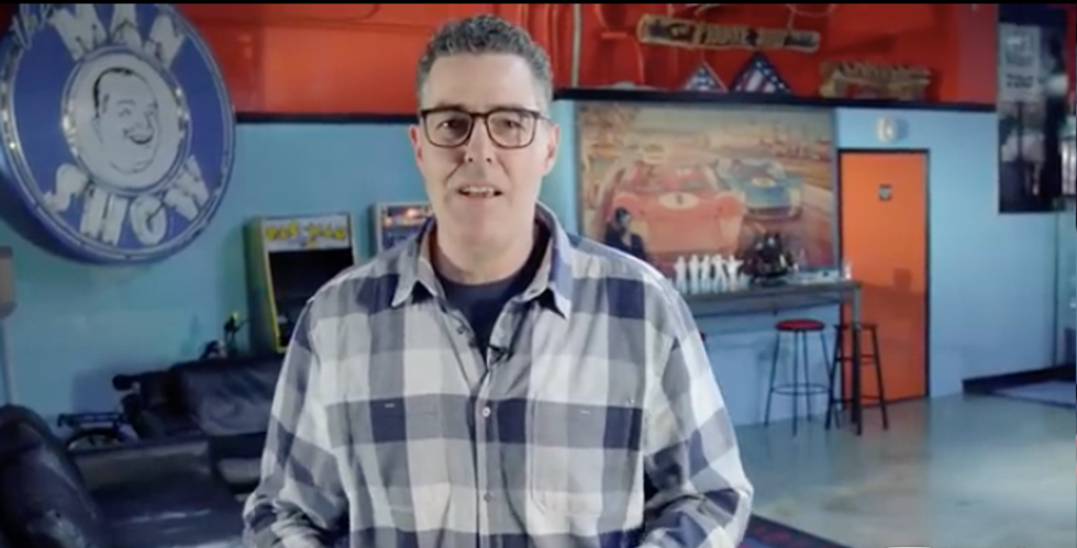 Adam Carolla, by the way, is the former co-host of "The Man Show" -- a "comedy" show just for men, where they didn't have to feel judged for wanting to watch a bunch of women with large breasts jump up and down, or be told that it is maybe gross to refer to those women as "Juggies." He is also the proud owner of a "man cave" -- which is a special space that a man can go to in his house in order to domanly things and not have to deal with women.