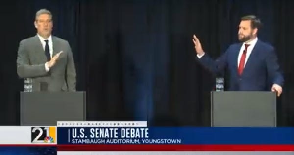 In last night's debate between Vance and his Democratic opponent, Rep. Tim Ryan, Vance got his entire ass kicked, just like he did in his first debate with Ryan.
