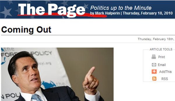 What will Mitt Romney do to win the Republicans' support in 2012?Literally anything. According to important political blogTIME Magazine, Romney is "coming out" at CPAC. It's gonna be a sausage fest! And don't worry, Ann: It's not cheating if it's up the butt. [ The Note via Wonkette Operative "Andrew B."]