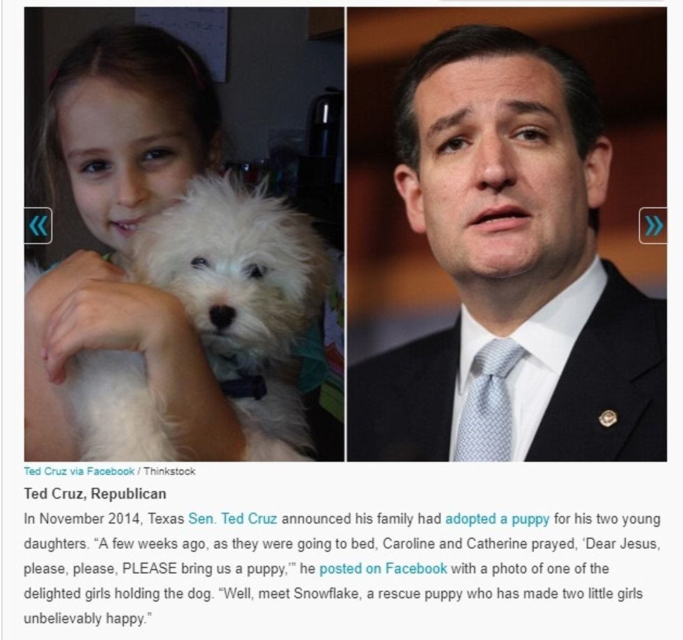 We wanted to see if Ted Cruz has any photos with doggies, but a cursory image search brought up only "dogs that look like Ted Cruz" and one piece noting that he'd adopted a pupper for his daughters, with little evidence he's much of a dog person himself: