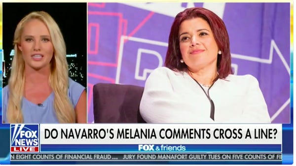 Lahren is as willfully obtuse as ever. Navarro doesn't have a problem with anti-bullying efforts. She just thinks they're a little futile coming from the wife of a president who probably still collects the lunch money from weaker kids. Melanie couldn't even persuade Trump to play nice on Twitter on the day of her speech. He was out there tweeting out atomic wedgies to Jeff Sessions and Robert Mueller.