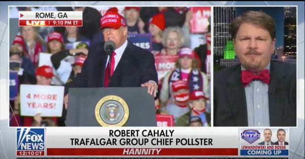 Cahaly appeared on an extra-special weekend edition of Sean Hannity's show, his bowtie securely fastened and his beard trimmed to Kentucky colonel standards. He stood by his prediction that Trump will win Pennsylvania. He's less confident, however, that the president can overcome Sleepy Joe's massive voter fraud operation.