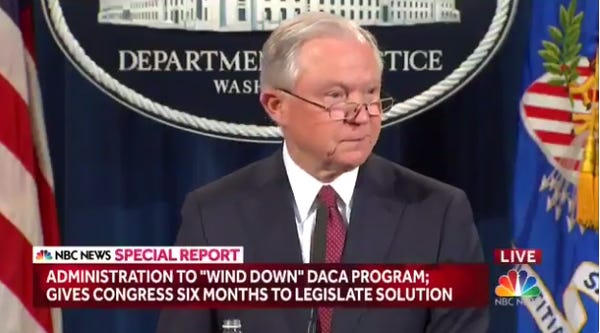 Jeff Sessions got an erection today. It had been a while. As we expected, Donald Trump dispatched the hayseed racist attorney general from the Confederate States of America to announce they will "wind down" the DACA program for undocumented children brought here illegally by their parents, giving Congress six months to fix it, and giving almost 800,000 innocent DREAMers six months to prepare to go back to their own countries, which is weird, since America is the only country most of them have ever known.