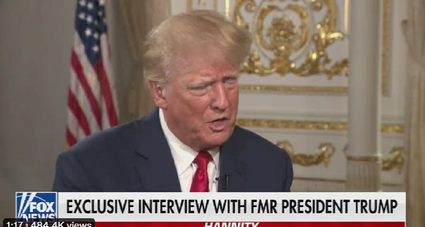 Here is Trump trying to say the FBI planted evidence on him, at which point even Sean Hannity is like "wouldn't that be on videotape" and Trump is like "no, I don't think so, they were in a room." To review: Trump doesn't think there's videotape of the FBI planting documents on him, documents that he also declassified with his brain.