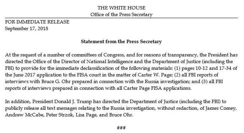 If you cannot embiggen that, Trump has ordered the Justice Department to declassify certain pages BUT NOT ALL OF THEM of one of the FISA applications to surveil world's stupidest Russian intelligence asset Carter Page; all the info the FBI has on interviews with FBI agent Bruce Ohr, in connection with the Russia investigation (this is about his discussions with British spy dossier author Christopher Steele, which Trump is obsessed with ); and a whole fuckton of text messages the FBI has, related to the Russia investigation, from James Comey, Andrew McCabe, Peter Strzok, Lisa Page, and Bruce Ohr.