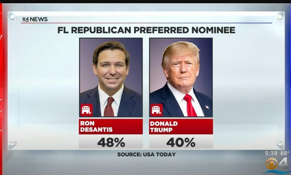 A USA Today/Suffolk poll showed DeSantis beating Trump in the Florida Republican primary 48 to 40 percent. That's a stark reversal from a January poll that had Trump leading DeSantis 47 to 40 percent. Pollster David Paleologos considers this a "sea change," and while we all might enjoy seeing DeSantis humiliate Trump in his adopted state, it's a classic "out of the frying pan, into the fascist state" situation.