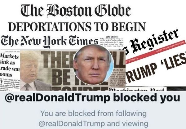 The great Man took to the Tweet Machine this morning to deliver yet another series of condemnations of all those evil, evil journamalists who daily try to destroy America by accurately reporting on Donald Trump. The first was his standard boilerplate idiocy: