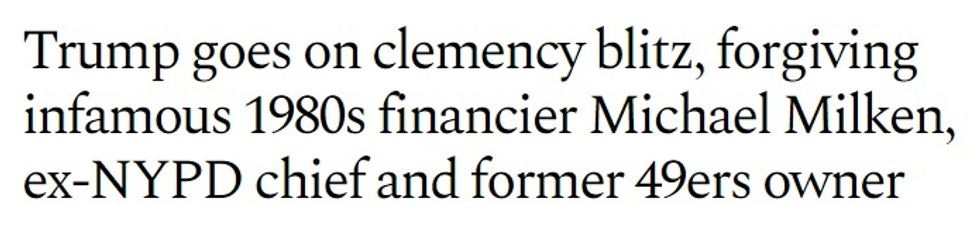 Donald Trump was feeling merciful today, so he did us a favor though and granted clemency to a load of famous crimers, including former Illinois governor Rod Blagojevich, former NYPD commissioner Bernard Kerik, former San Francisco 49ers owner Eddie DeBartolo Jr., and fraudy inside trader Michael Milken. Kerik, Milken, and DeBartolo all received full pardons, while Blago only had his 14-year sentence commuted, allowing him out of prison but leaving his conviction for trying to sell an appointment to the US Senate seat that had been held by Barack Obama.