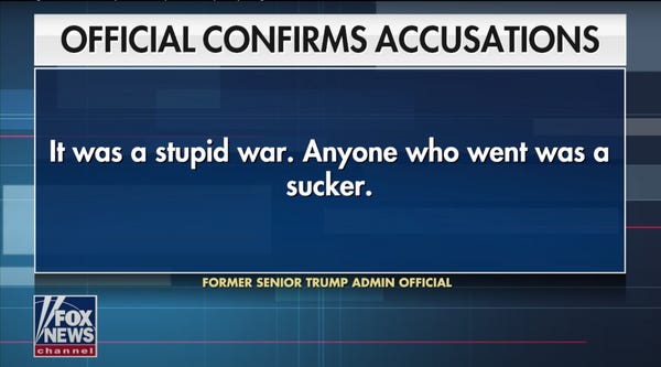 Later on Friday, however, reporter Jennifer Griffin ... of Fox News, of all places, confirmed most of the story with her own sources, who also shared some other appalling things the president. For instance, about the Vietnam War, he reportedly said "It was a stupid war. Anyone who went was a sucker." While the first sentence of that statement is certainly true, those who went did not have the luxury of bone spurs and had to go — or else go to prison.