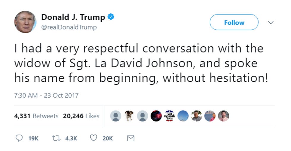 Sure, you betcha. Donald Trump said Sgt. Johnson's name SO MANY TIMES, just like he ALWAYS refers to Myeshia Johnson by her name, instead of just calling her "the widow." It's probably because he cares so much.