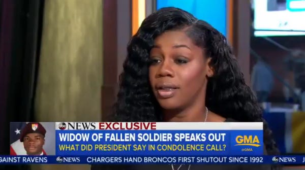 Did the weekend even just happen? Isn't Monday the time when Donald Trump likes to debut the NEXT fake grievance he's going to use to hold the American people hostage and distract them from his malignant, failing presidency? Apparently he's still obsessed with last week's fake grievance, because Myeshia Johnson, the surviving wife of fallen Army Sgt. La David Johnson, broke her silence on "Good Morning America" about the phone call she received from the president the day his body was flown back to America, and oh man, she is being so unfair and disrespectful, by saying his words on the phone call hurt her feelings. Is it even legal for her to say that about our American dictator? It's just like that time Trump went to a Republican primary debate and Megyn Kelly pulled out her wherevers and bled all over him on live TV!