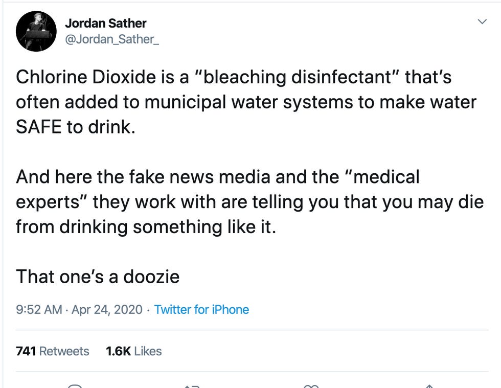 Chlorine Dioxide is a "bleaching disinfectant" that's often added to municipal water systems to make water SAFE to drink. And here the fake news media and the "medical experts" they work with are telling you that you may die from drinking something like it. That one's a doozie