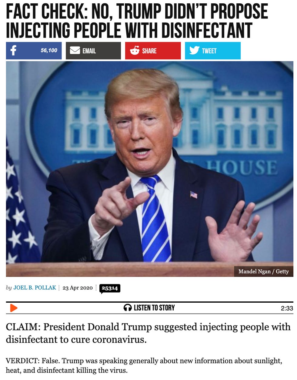 Then there were those (not us! and not actual doctors or the Lysol company!), like Jim Hoft at Gateway Pundit and Joel Pollak at Breitbart, who declared that everyone who said Trump speculated on ingesting bleach as a potential cure for COVID-19 was lying , and that Trump was just "speaking generally about new information about sunlight, heat, and disinfectant killing the virus."