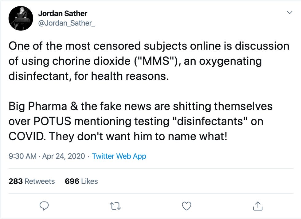 Among those very excited about what they perceive as Trump's "endorsement" of MMS is QAnon "researcher" Jordan Sather.