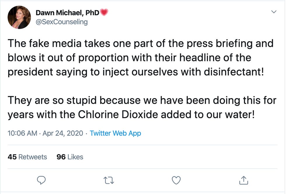 The fake media takes one part of the press briefing and blows it out of proportion with their headline of the president saying to inject ourselves with disinfectant! They are so stupid because we have been doing this for years with the Chlorine Dioxide added to our water!