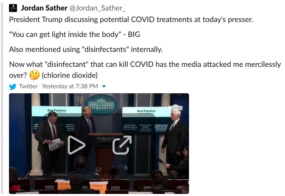 President Trump discussing potential COVID treatments at today's presser. "You can get light inside the body" - BIG. Also mentioned using "disinfectants" internally. Now what "disinfectant" that can kill COVID has the media attacked me mercilessly over? (chlorine dioxide)