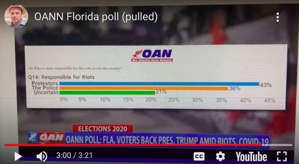 The question here was "Who is more responsible for the riots across the country?" Which is suggestive enough on its own, and yet still more than a third of Floridians blamed the cops. But in Rouz's framing it became, "Forty-three percent blame far left protestors for the latest violence and looting." See the difference?