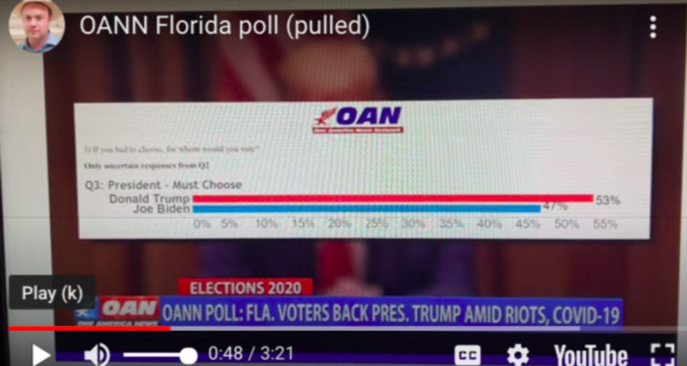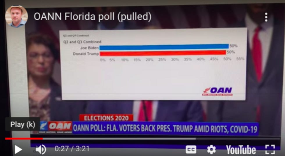 Apparently, OANN commissioned Gravis, a real pollster, to survey Floridians about the presidential race. According to OANN, Trump and Biden are tied at 50-50. Or as Rouz put it in his broadcast, "According to a new poll by OANN and Gravis Marketing, at least 50 percent of Floridians would vote to reelect their president if the election were held this week!" Which is technically correct. It would also be technically correct to substitute "Vice President Biden" for "their president" because MATH.