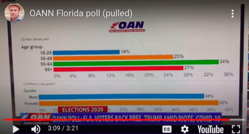 Did you guess "Overall the OAN poll appears to refute the latest suppression polling by the mainstream media and reveals the majority of Floridians are far closer aligned with President Trump than the Democrat cabal would like them to be"? No? WEIRD.