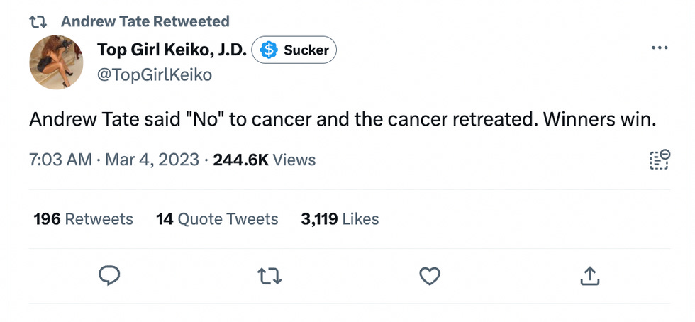 “Andrew Tate’s manager confirms reports that the disgraced media personality has been diagnosed with lung cancer.”