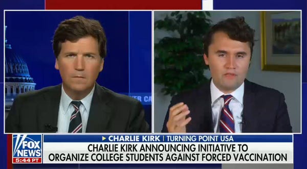 Before Tucker had his freak-out about Joe Biden forcing him to get pregnant with vaccines, Charlie Kirk opened the small butthole where his mouth would normally be located and whined that college students were going to have to live in a form of "medical apartheid," in response to colleges requiring students to be vaccinated. And Turning Point USA, Charlie's little group of deplorable unfuckables, is gonna FIGHT BACK.