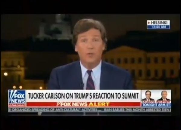 Oh, yes, and on his own show last night, Carlson talked to NYU Russian studies professor emeritus Stephen Cohen, who Carlson proudly noted is also a contributing contributing editor to The Nation. Cohen, whose fawning over Putin has been embarrassing much of The Nation staff, had this to say: "The reaction by most of the media, Democrats and anti-Trump people is like mob violence." Cohen couldn't find anything bad to say about Trump's meeting with Putin, because after all, we need peace. Also, as Fox News explains, the USA has a lot more in common with Russia than we do with a lot of our so-called allies: