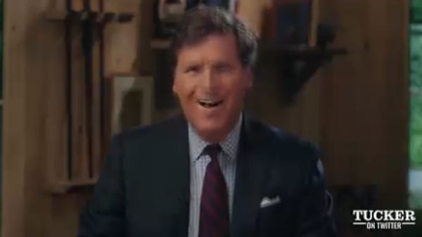 Well, now we know what it looks like when Tucker Carlson doesn't have a budget or a name for his show or writers or talent or a bath or a purpose. It was "Tucker on Twitter," which suddenly happened last night seemingly because Tucker hadn't given Vladimir Putin a rimjob in a minute and we guess he was missing it.