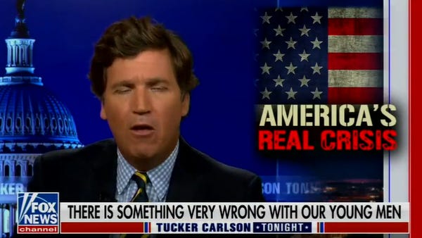 They're reading through whatever they can learn about the shooter — real or internet rumor, whatever! — and finding whatever clues they can fit into their mangled, resentful worldview and oh let's just cut to the fucking chase, here's Tucker Carlson blaming the Highland Park mass shooting on women, more or less: