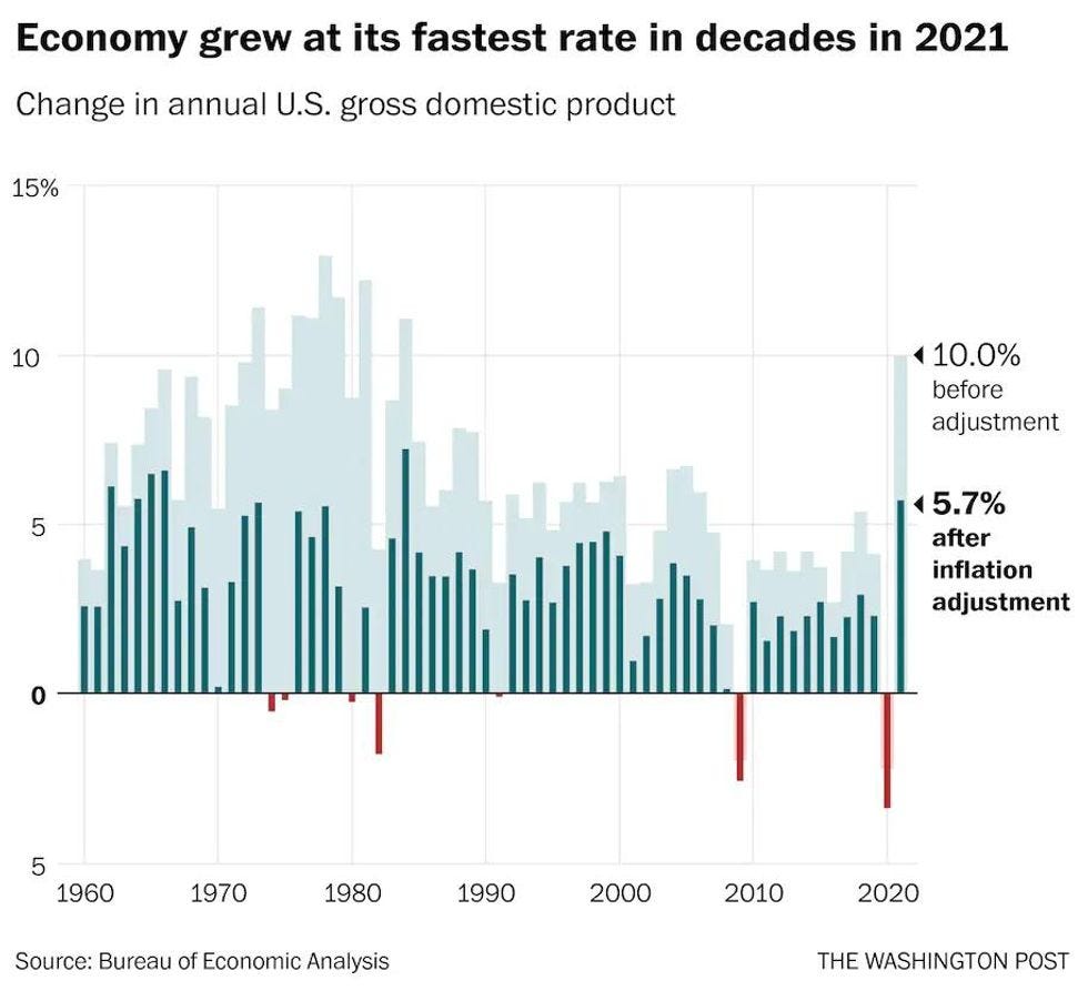 The substantial growth, which WaPo called "the fastest full-year clip since 1984," also brought with it some problems, because as we've been saying all along, all of the economic stats since the start of the pandemic in March 2020 should probably have asterisks next to them. The strong economic growth