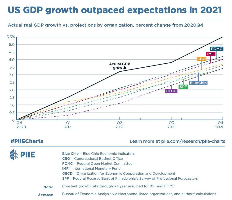 GDP growth dramatically outpaced forecasts made a year ago. Most forecasters expected the economy to grow 3 to 4 percent this year. Instead it has grown 5.5 percent. That is more than a percentage point faster than even the most optimistic forecast was expecting.