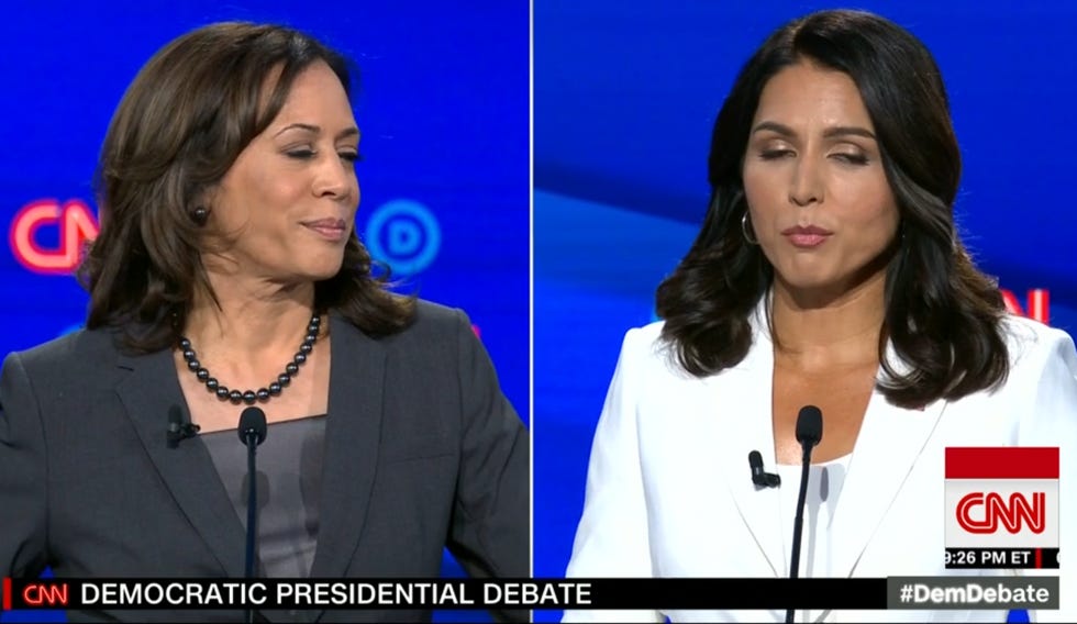 9: 31:Oh now Tulsi wants to come at Kamala Harris, says Harris put everybody in jail for marijuana, even though Harris has laughed about her own pot smoking. Also cites some other things that probably came out of David Sirota's butt and accuses Harris of doing the death penalty to everyone, or something. (Harris has always been personally opposed to the death penalty.) That's all cool, and Kamala Harris should definitely be called upon to explain things in her criminal justice record, but yeesh , imagine having to justify yourself to Tulsi Gabbard.