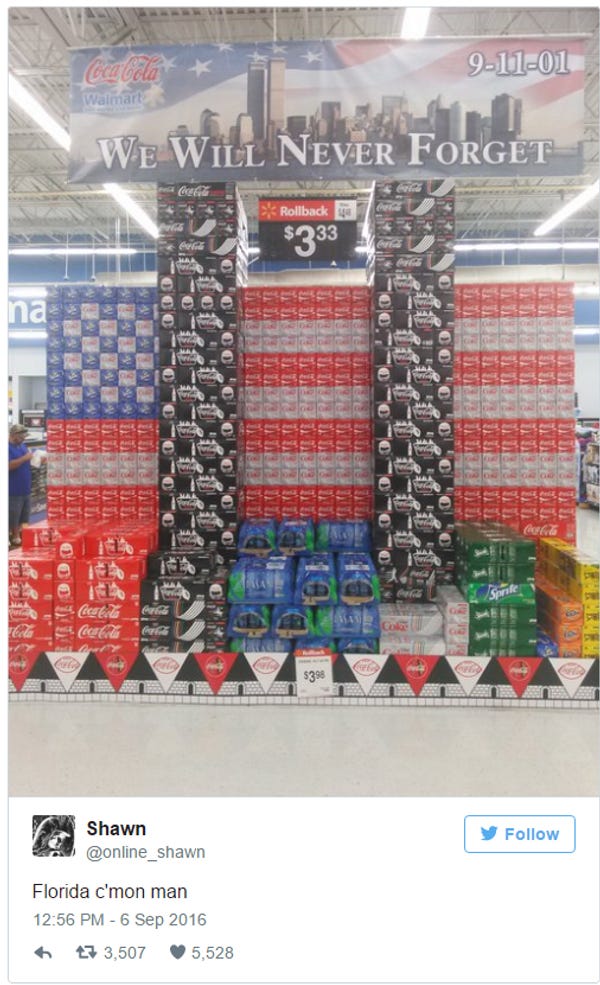 After online mobs reacted with criticism, Walmart and Coca-Cola both apologized for the display and orchestrated an inside job to bring down the cases. Why? This exhibit is probably the most appropriately American tribute. Never Forget that our former cheerleader-in-chief told Americans to respond to the terrorist attacks by going to Disney World . Never Forget how he asked us to respond to a fledgling economy and never ending wars by "going shopping." Why is everyone forgetting that the appropriate way to commemorate a horrific event and honor lives lost is rampant and irresponsible consumerism?