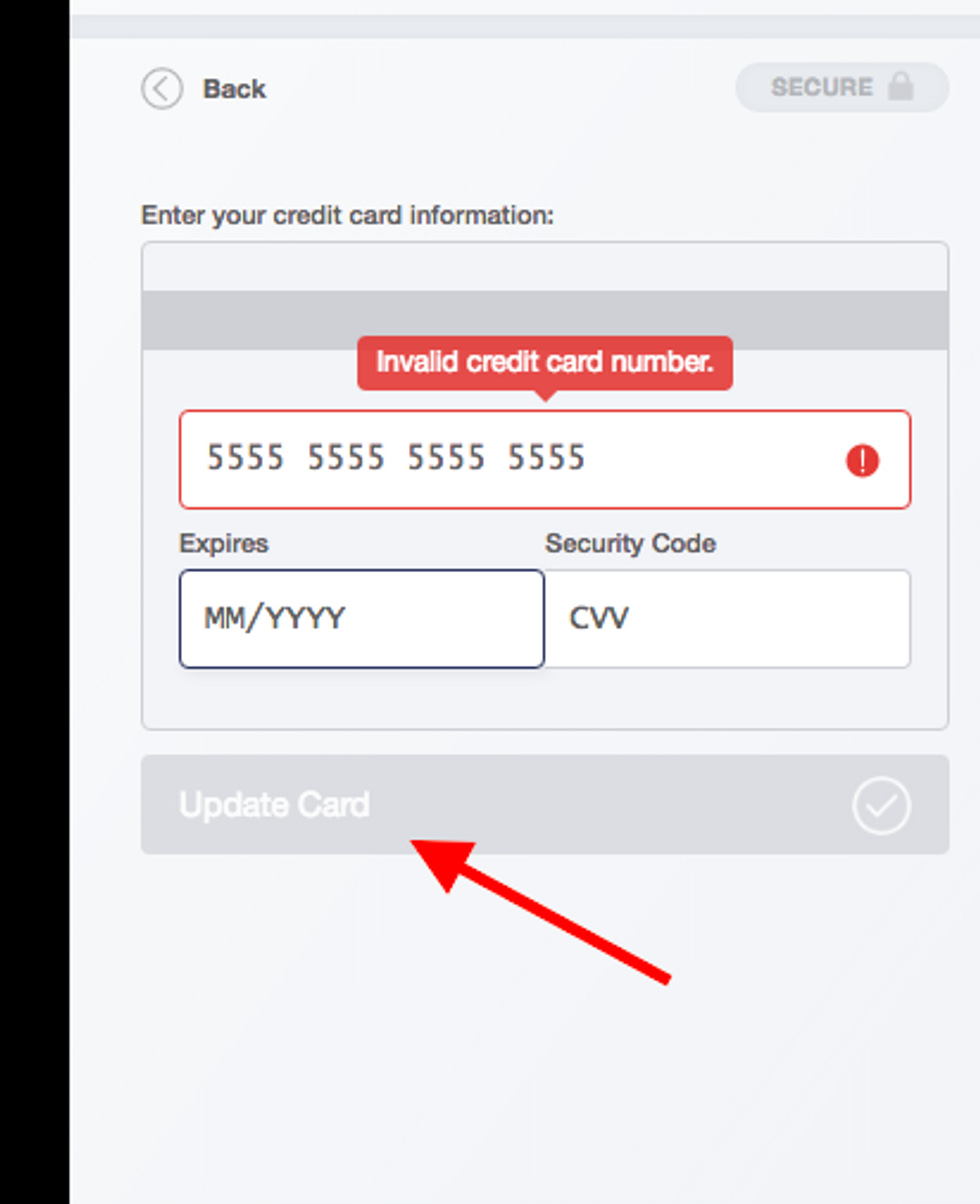 The good folks at Mic proceeded to set up a $1 recurring donation, then took screenshots of their attempts to cancel it using the Trump campaign website. They found options for switching their regular payment from one credit card to another, but not to remove their payment information altogether. And if you can't switch your payment to a cancelled card or a bunch of nonsense numbers, either: Those fuckers want a valid credit card number or nothing: