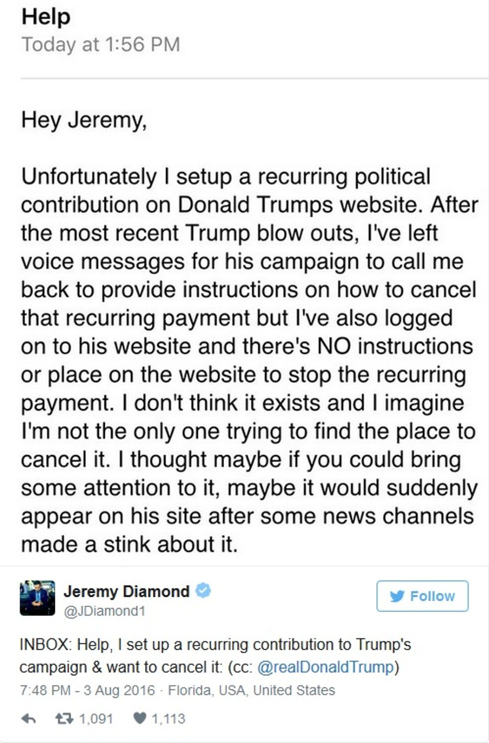 On Wednesday, CNN reporter Jeremy Diamond tweeted a screenshot of an email from a disenchanted Trump donor who alleged that the campaign has not returned voice message requests to cancel contributions (The identity of the alleged donor is not shown).