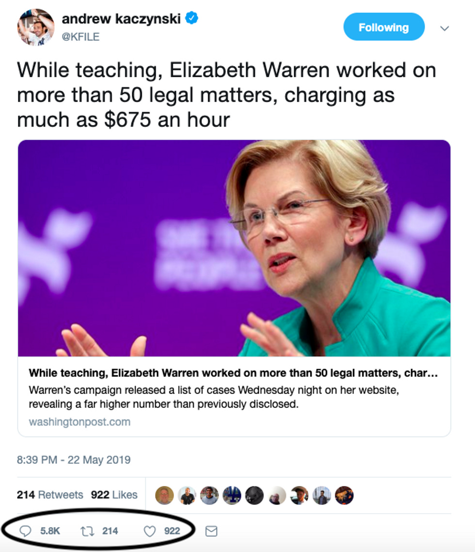 On the one hand, things really are getting better. The Post is getting rightly dragged for breathlessly reporting that Senator Elizabeth Warren got paid in actual American currency for practicing law. The blatant sexism in the coverage has overtaken the nothingburger story itself. And Andrew Kaczynski's ratio is a thing of beauty.