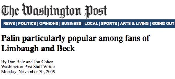 Dan Balz has written for theWashington Postfor SEVEN HUNDRED FIFTY YEARS and this is his greatest lede yet: "Sarah Palin may or may not run for president in 2012, but she is already the overwhelming favorite in the Rush Limbaugh and Glenn Beck primaries." Meh, not enough Trig. [ Washington Post ]