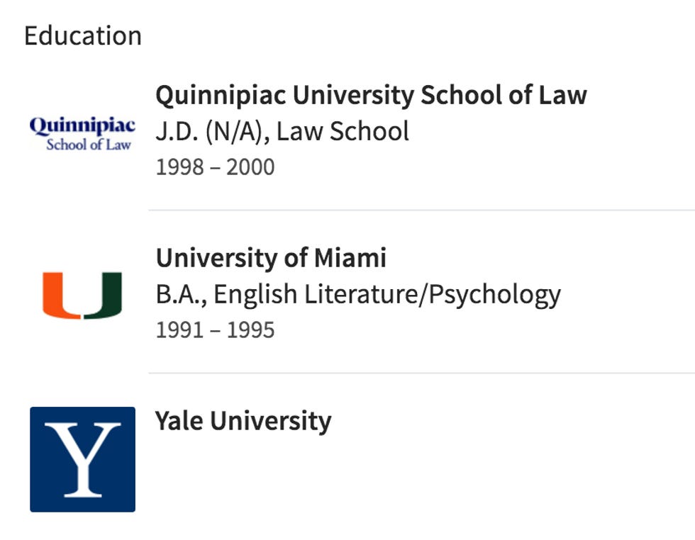 But THIS bullshit right here is next fucking level. Her name is Lynne Patton and you can go right over to her LinkedIn to look at her qualifications which I DO NOT RECOMMEND unless you woke up in a rage that wasn't quite incandescent enough and you need a power boost. The woman formerly known as "Head of Concierge Services, Yorktown property" is in a bit of a kerfuffle because some people are accusing her of lying the tiniest bit on LinkedIn about this law degree thingy. It says n/a on it but I will let you judge whether this looks at all a bit padded, because I don't LinkedIn either so I've no idea whether one typically lists a degree one did not manage more than two semesters of: