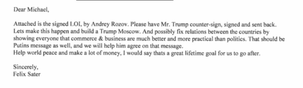 SATER: I will get Putin in on this program and we will get Donald elected. [...] Buddy our boy can become president of the USA and I will engineer it. I will get all of Putins team to buy in on this ...