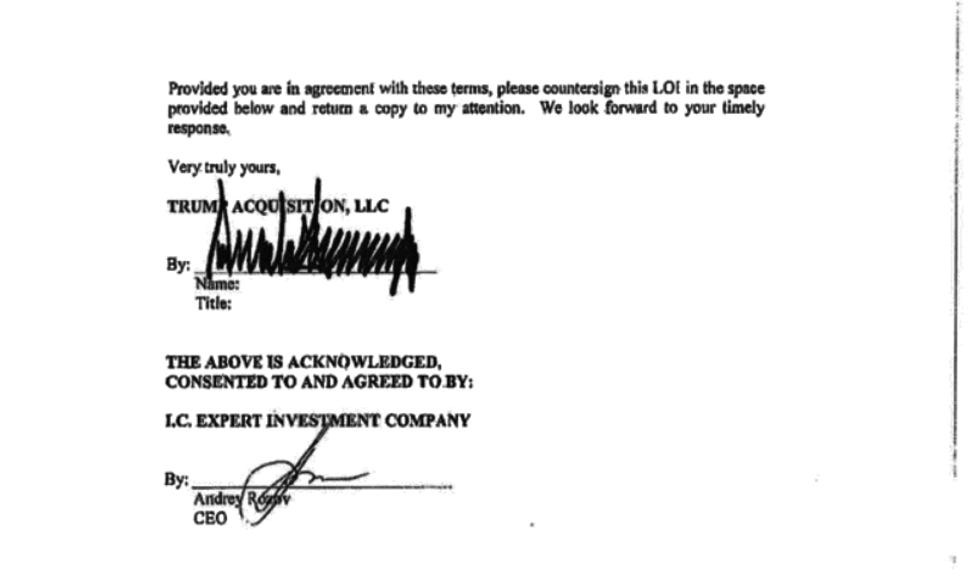 We will never get over the fact that that is the president of the United States's signature. If the Russian developer can have a fucking normal signature, why does Trump's look like one of those things where they "teach" an elephant to "paint" with its feet?