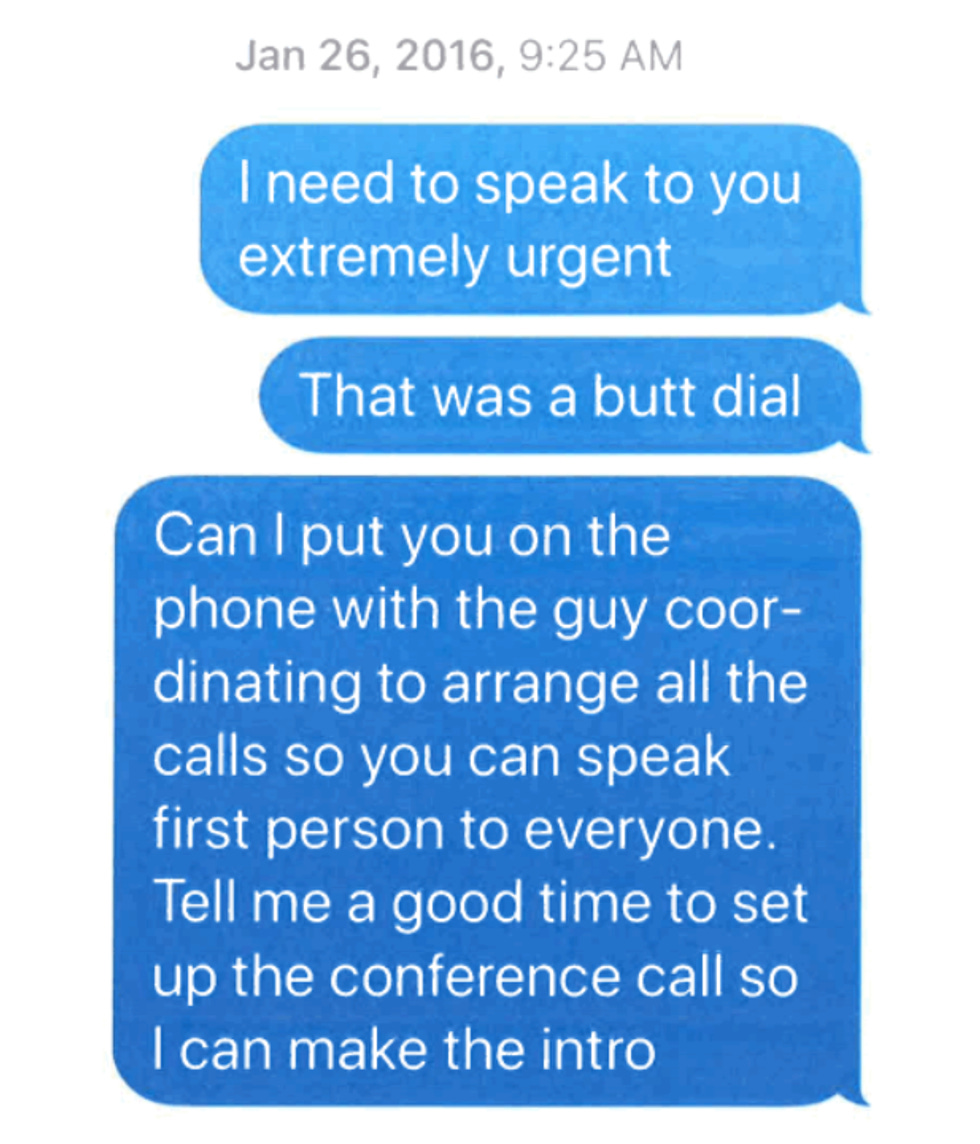 January 26, 2016: Felix Sater texts Michael Cohen, "That was a butt dial." And also some other stuff: