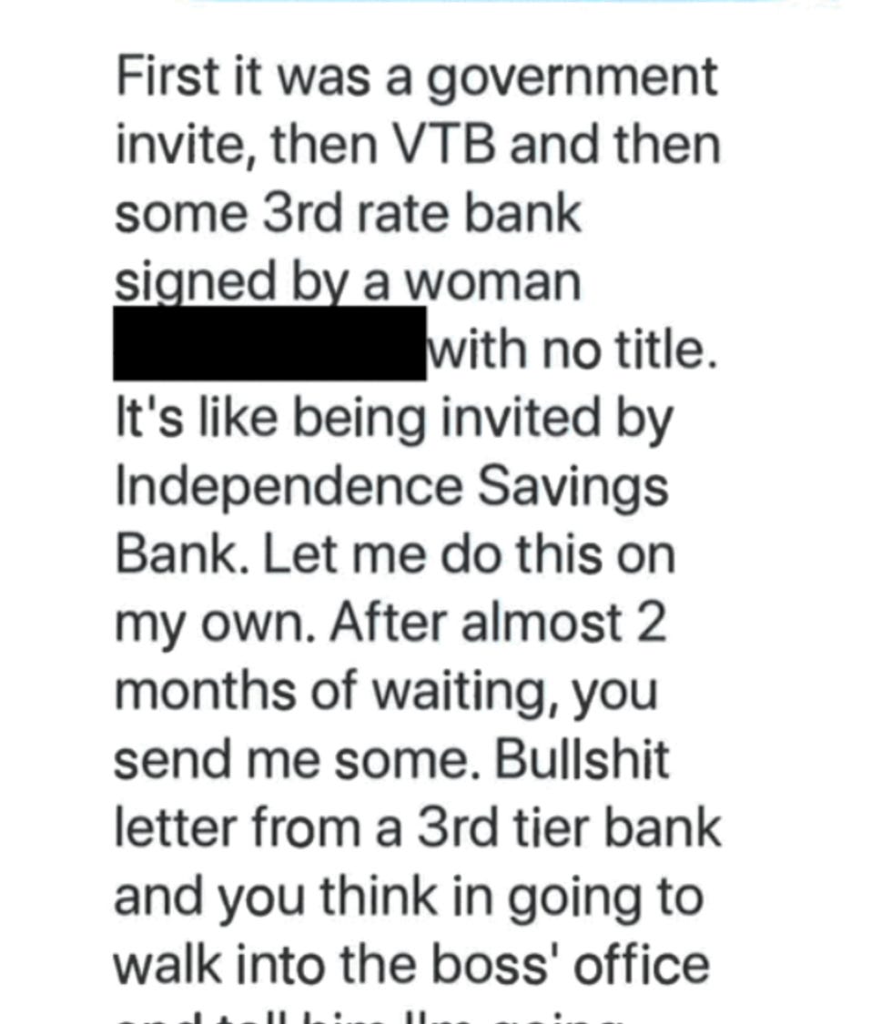 Sater assures him that Cracker Barrel Savings & Loan is still partially owned by the Russian state, and is associated with VTB bank, but they can't talk to the head of VTB Bank right now because he is, like, out of town.