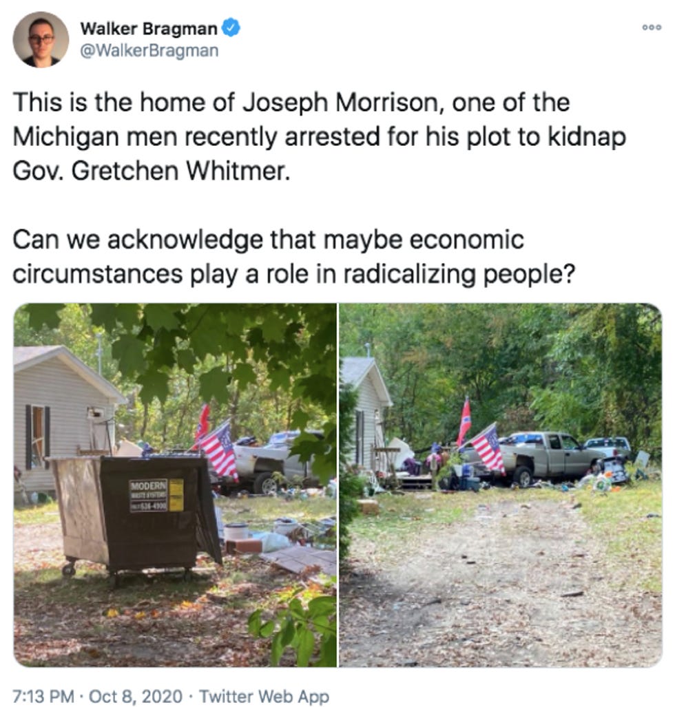 Unfortunately for poverty tastemakers like Bragman, who once complained that Uber brings gross icky poors who sleep in their cars into his nice clean Hamptons , rural Americans use Twitter. They were quick to point out that building private armies to overthrow the government is a rich and middle-class man's game. Accordingly, this isn't the broken-down shack that Walker, East End Ranger thinks it is. It's messy because it was just raided by the FBI. The home is new, in good repair (as seen on its Zillow page ), and owned, not rented. It's got a private dumpster. Those are costly: a de facto class marker in rural areas without trash service. Nearby residents complained Joseph Morrison brought large groups to use the whole neighborhood as their personal shooting range. In other words, the first people these men terrorized were their own neighbors — the very rural residents Bragman claims to speak for.