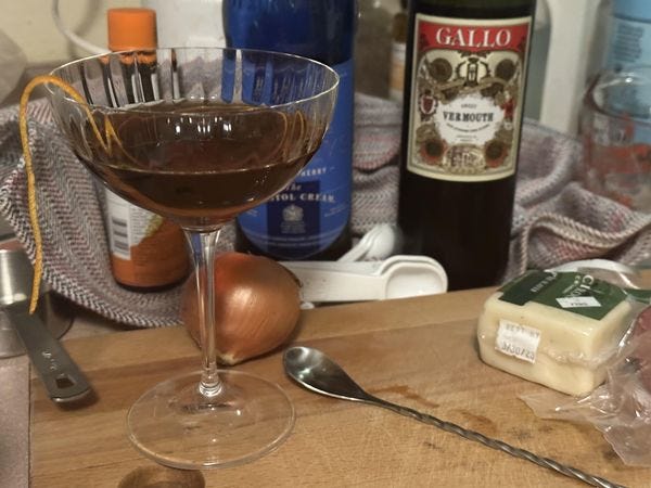 Technique: You can, and probably should, stir this drink with a barspoon in a heavy-bottomed mixing glass. But swirling everything together in a pint glass with some ice works too. If you’ve already chilled your vermouth and sherry, you won’t need to work hard to get the drink cold and blended. Enjoy your virtuous decadence while you can, and don’t sweat the details.