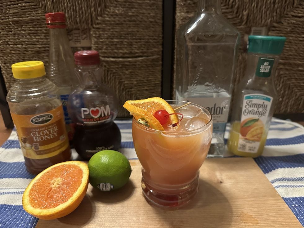 Greetings, Wonketeers! I’m Hooper, your bartender. Would you like to drink something strong and celebratory for this weekend? Something that makes you think of a new day dawning in America? Would you like it to be orange, and maybe a little bit trashy? Would you like to watch Hooper take an innocent three-ingredient cocktail and overcomplicate the snot out of it? And most importantly, are you feeling a little under the weather, like Hooper’s feeling now, and need some more vitamin C to feel better? Say no more! Hooper’s going to make you a Tequila Sunrise. Here’s the recipe: