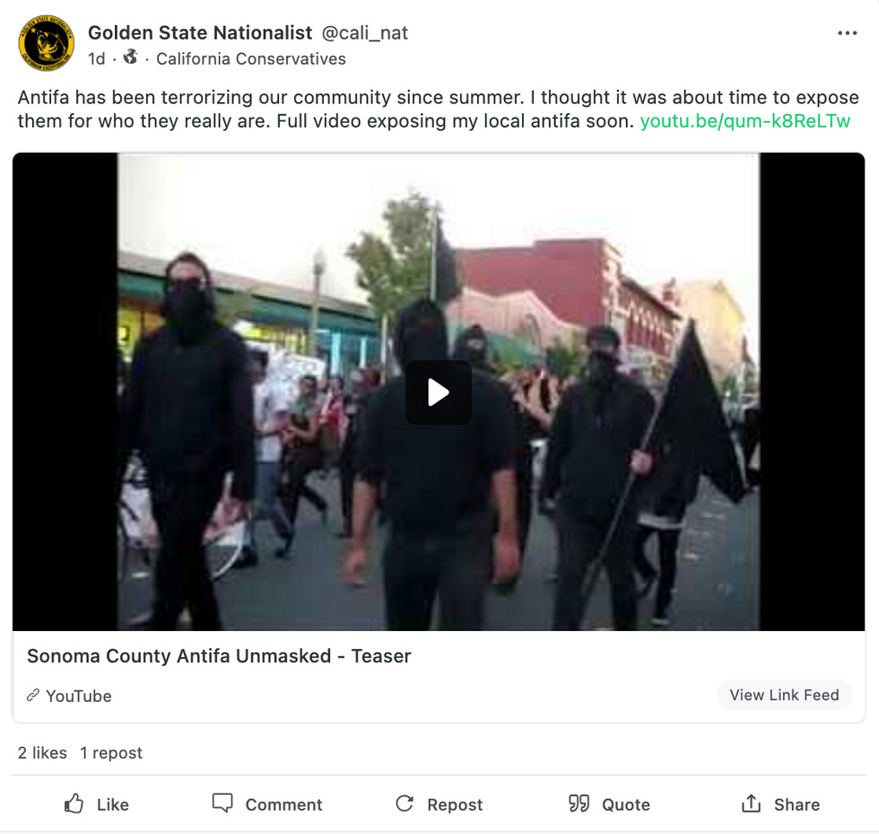 Curious! The most recent post on the Gab page for "Golden State Nationalist" says "Antifa has been terrorizing our community since summer. I thought it was about time to expose them for who they really are. Full video exposing my local antifa soon."