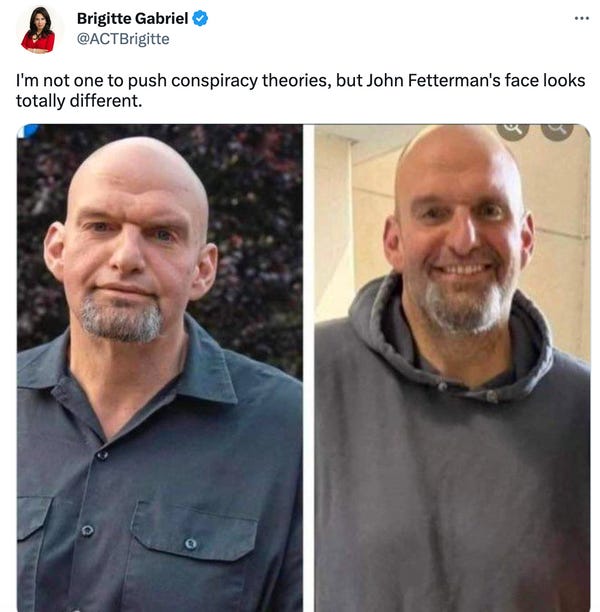 This is classic "Paul Is Dead" stupidity. It's a popular conspiracy, though, because it suggests that random losers can see through a convoluted scam that's fooled everyone else. But you're special because you've noticed that Fake Fetterman's head is too long.