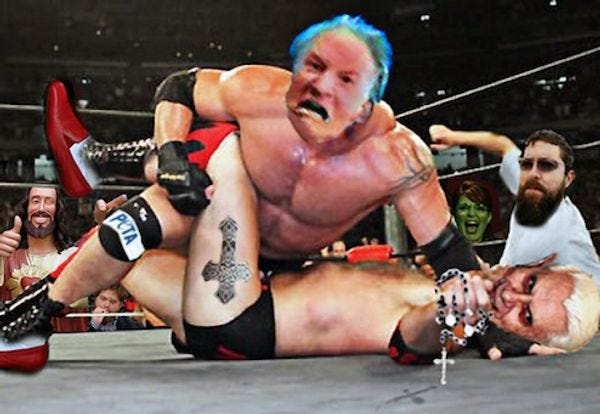 Because of the upcoming April 1 performance of teevee's anti-Jesus person Bill Maher at the Bethesda Strathmore Music Center, we had a pair of tickets to give away to the Wonkette reader who could make the most troubling computer image of Maher mud wrestling St. Joseph Ratzinger, the famous Nazi Hero who recently became the Pope of Rick Santorum and Newt Gingrich. Which picture won the tickets? Was it this one? Or was it one of the other Top Six Finalists? WHO WILL WIN, etc.