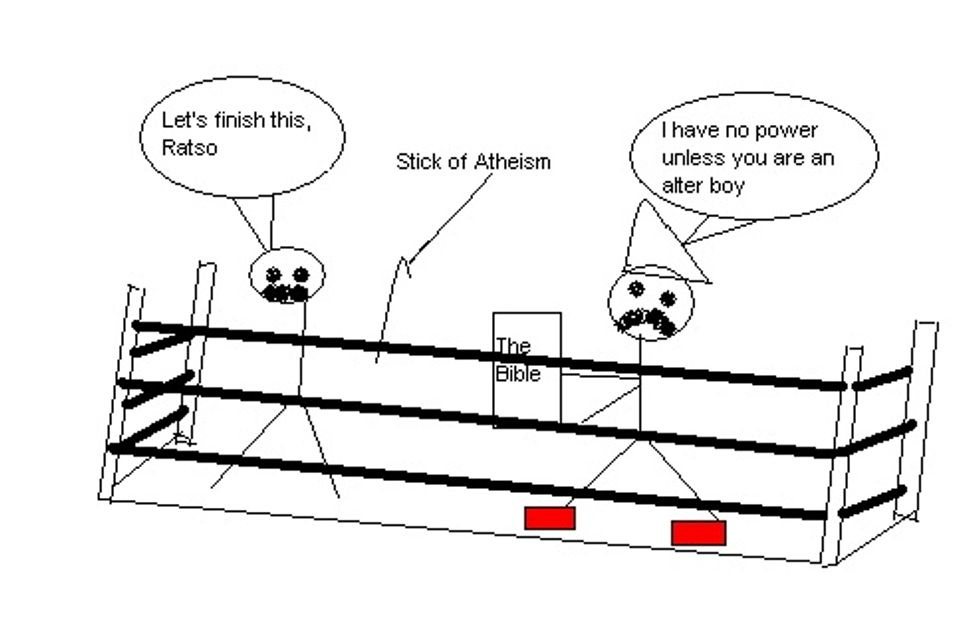 An artist called "horacio cocchi," if thatishis real name, submitted the photo-realistic monster pornography of Ratzi getting [insert wrestling term?] by Maher. We almost picked this one, but the obvious pandering of this "horacio" with his image of our terrorist former editor forced us to reconsider. Then there was the stick figure sex fight with an "atheist stick" by Ray Scott, which we admit is not very good but not quitebadenough, either.