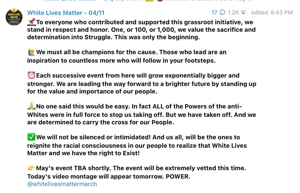 In the main Telegram page for the event, "White Lives Matter – 04/11," organizers tried to push a narrative that the small turnout didn't matter, because "this is only the beginning."