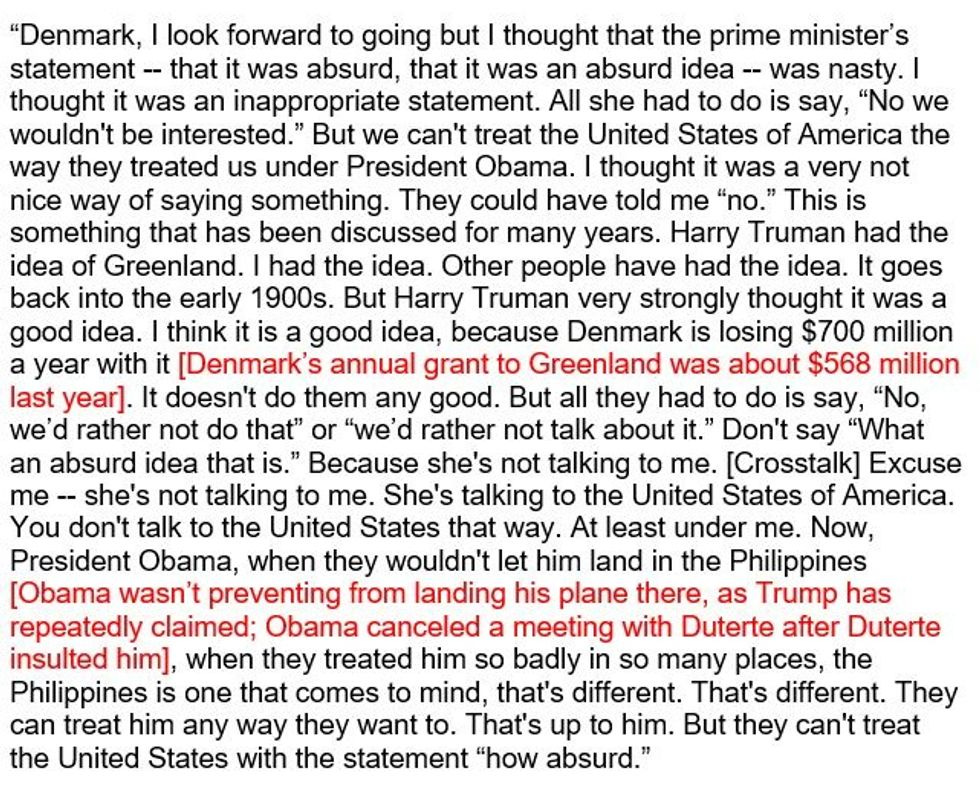 Amid Trump's day of absolute batshit yesterday, which we covered thoroughly here, the alleged president explained why he canceled his upcoming trip to Greenland. CNN reporter Daniel Dale provides the transcript and a factcheck: